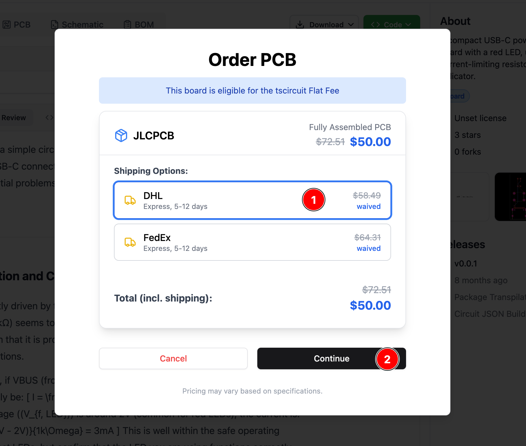 When you click the order button, a dialog will appear showing quotes from different vendors. Currently, JLCPCB is the only available vendor, with more vendors coming soon. Compare the prices, lead times, and shipping options, then select your preferred vendor and click continue.